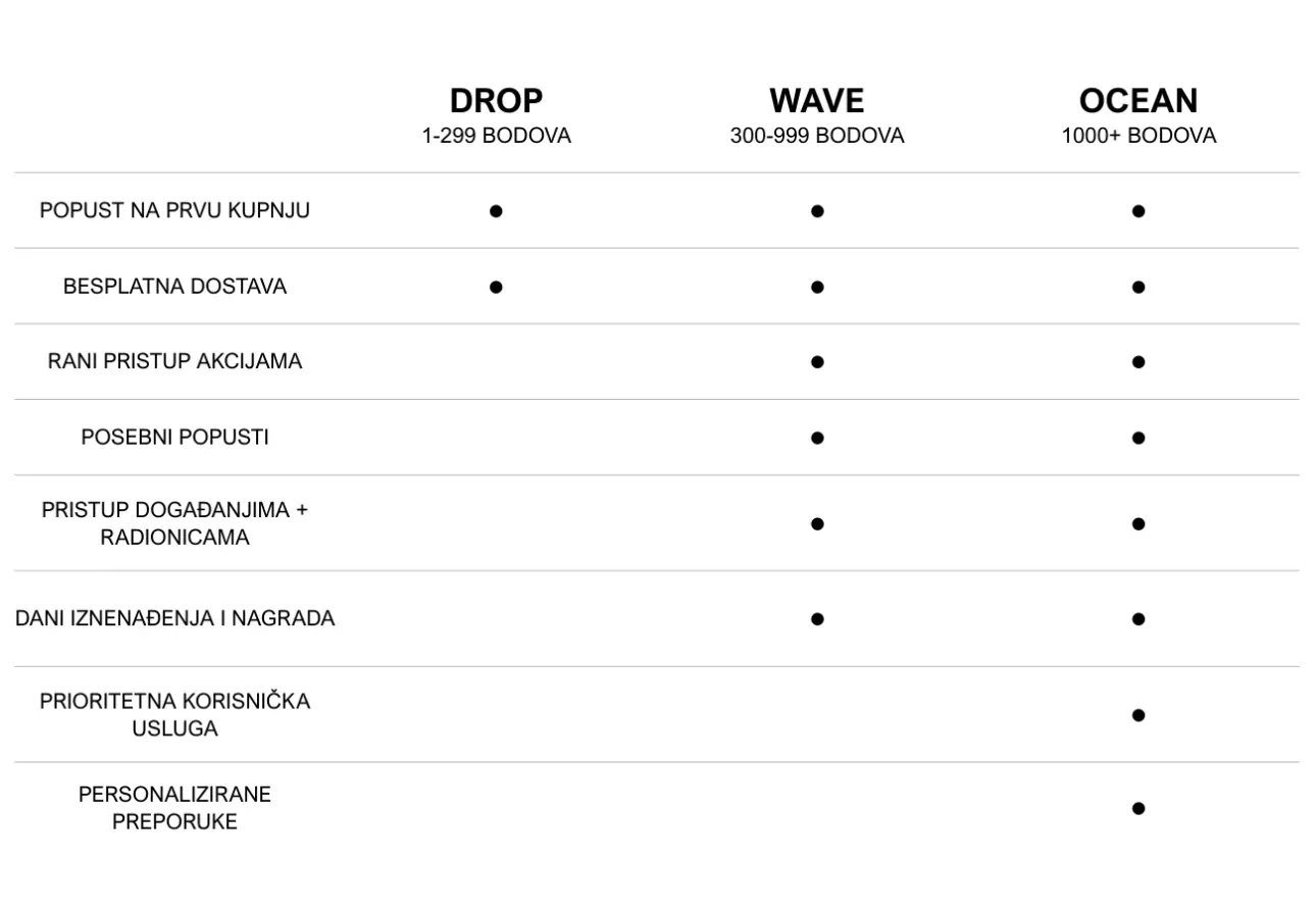 2. Skupljaj bodove Svaka kupnja ti donosi bodove – što ih više imaš, prelaziš iz Drop → Wave → Ocean i otključavaš nove pogodnosti.